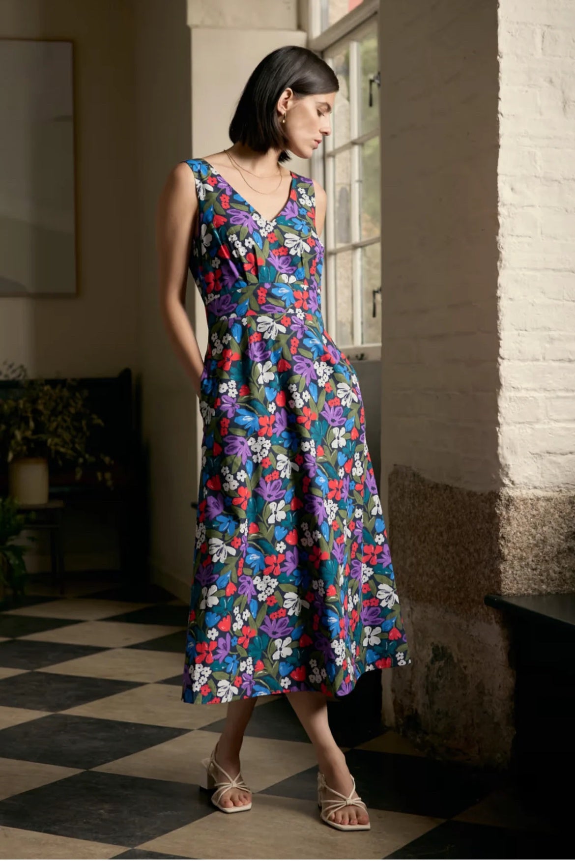 This printed summer dress features a timeless fit-and-flare silhouette, reimagined with a modern V-neckline and wide waistband for a flattering shape. Crafted from light, woven organic cotton, it’s soft, breathable, and drapes effortlessly—showcasing the vibrant print in full flow. Whether you’re heading on holiday or dressing up for an event, this is an easy-to-wear piece with a feel-good finish. Bonus... it has pockets!