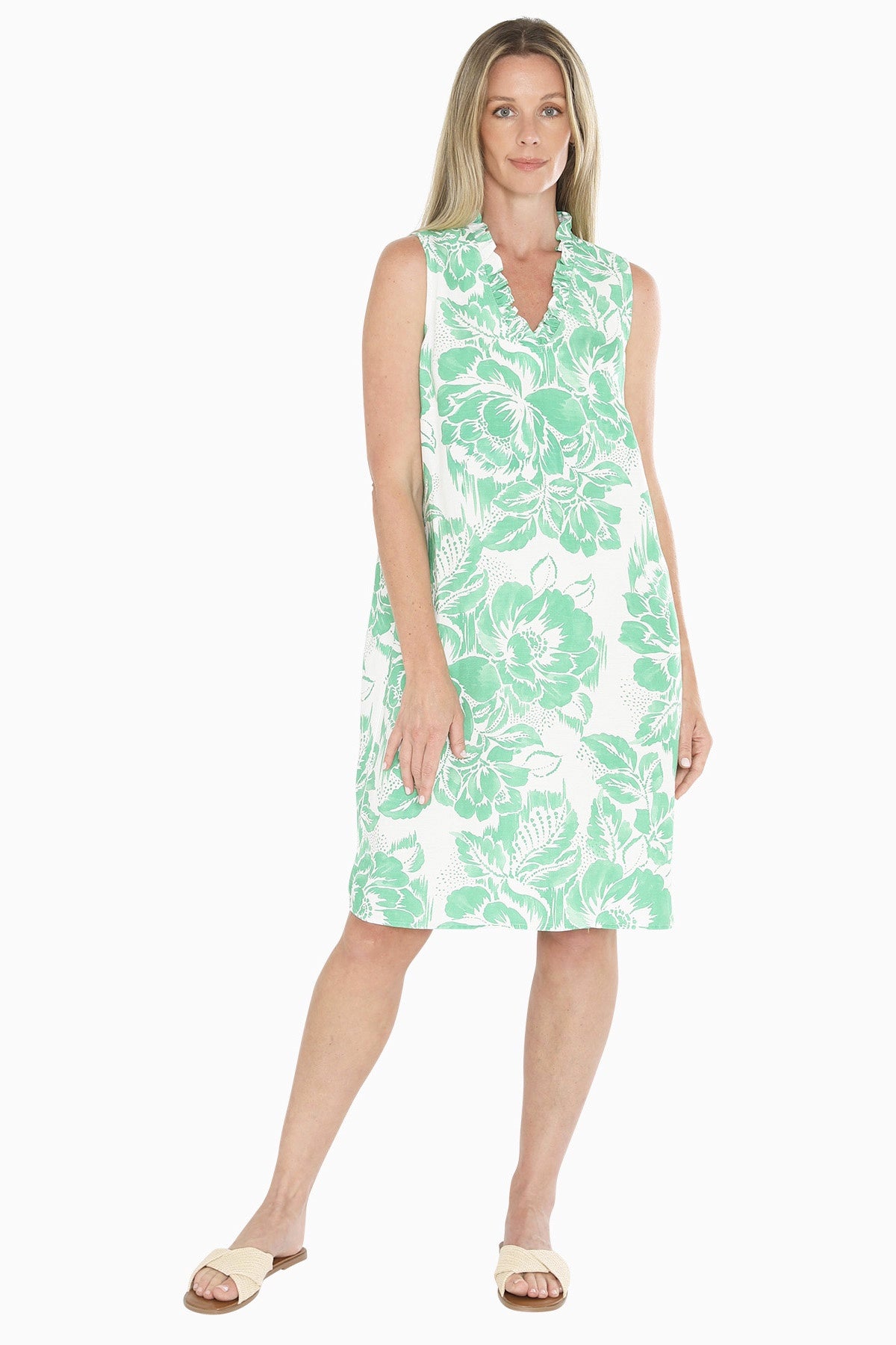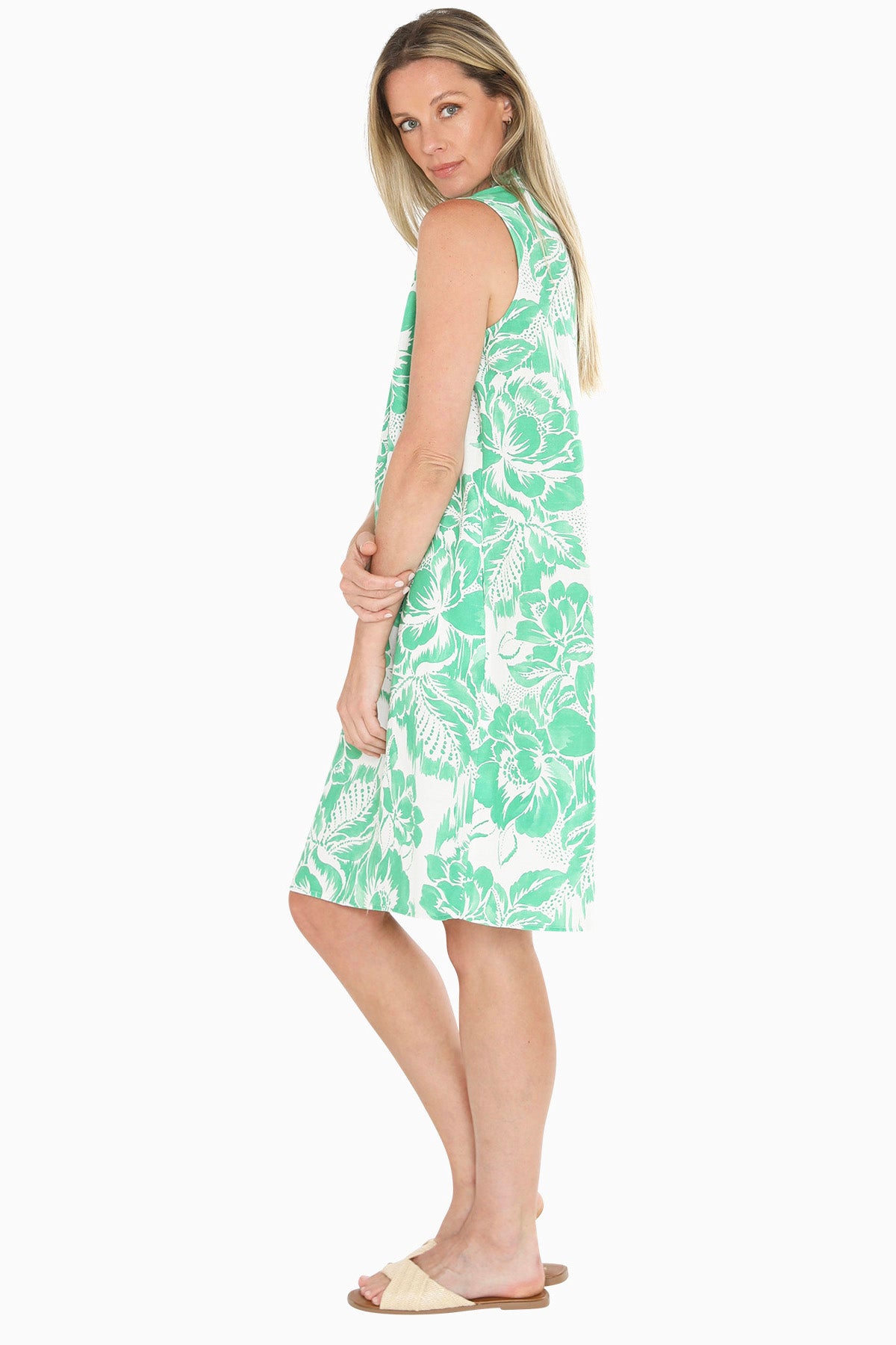 The Tuscan Rose Dress in Apple offers a refined sleeveless design crafted from a breathable linen blend for comfortable all-day wear. Its shift silhouette falls to a flattering mid-length, while side pockets add practical convenience. A delicate frill trim around the V-neckline provides subtle elegance, making this dress an effortlessly stylish choice for warm-weather occasions.